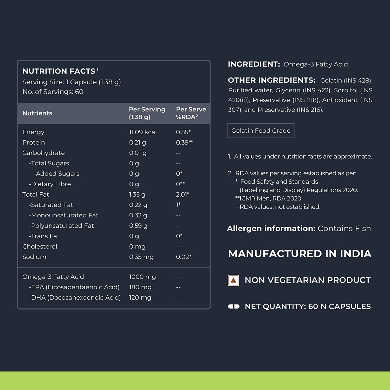 ✅ Nutrabay Omega 3 Fish Oil contains 1000 mg of Omega 3 with 180 mg of EPA & 120 mg of DHA.